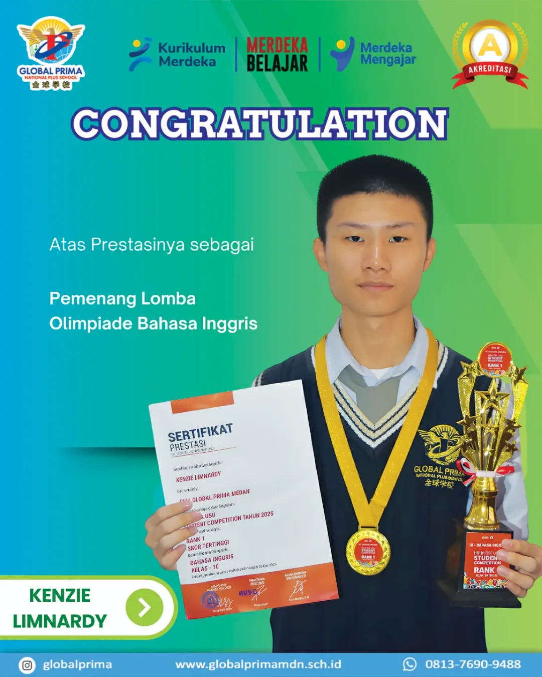 Selamat kepada siswa SMAS Global Prima atas prestasi yang diraihnya dalam Olimpiade Bahasa Inggris, atas nama : Kenzie Limnardy (XI – C) dengan perolehan Medali Emas & Juara 1 Ranking Tertinggi level SMA/MA
