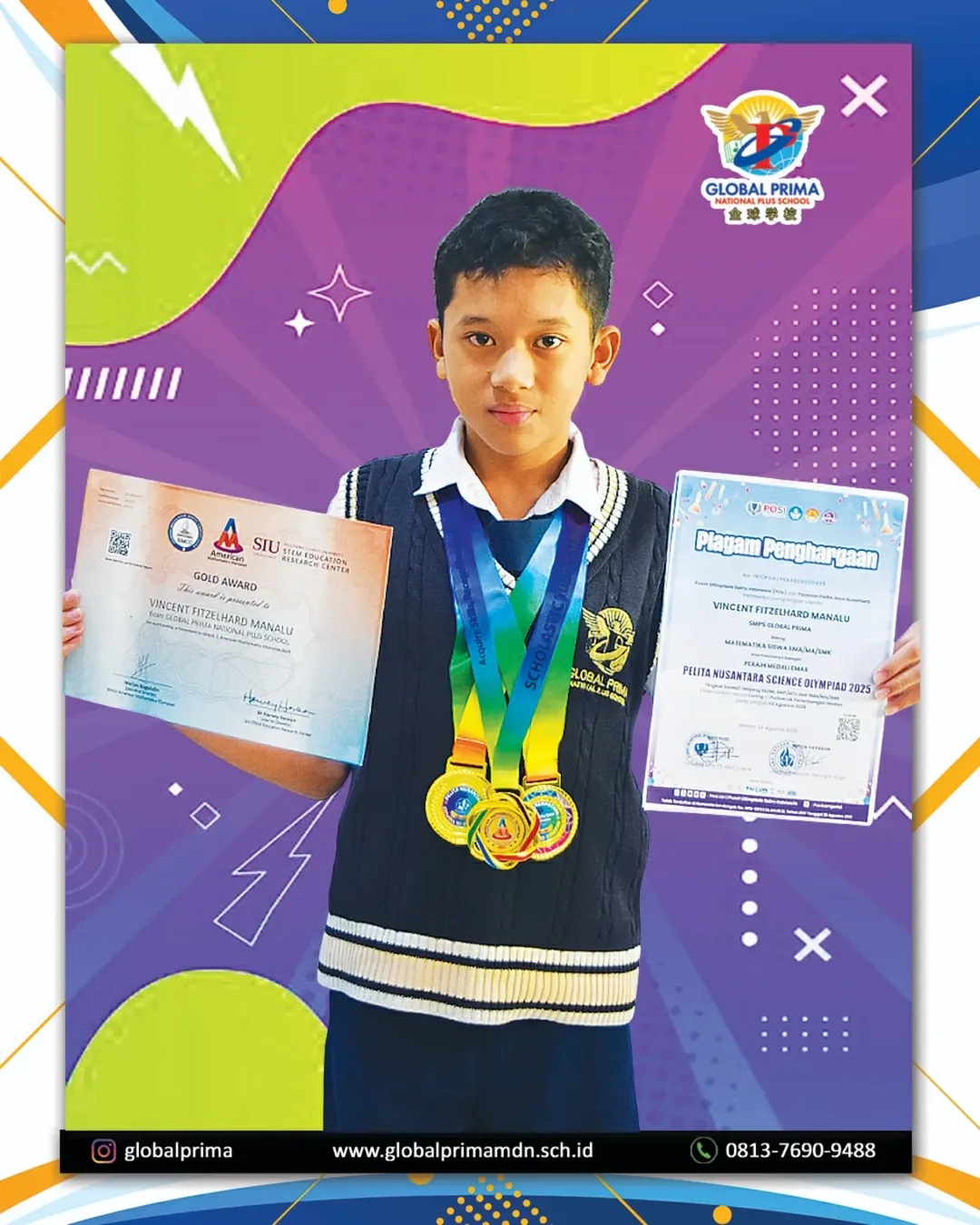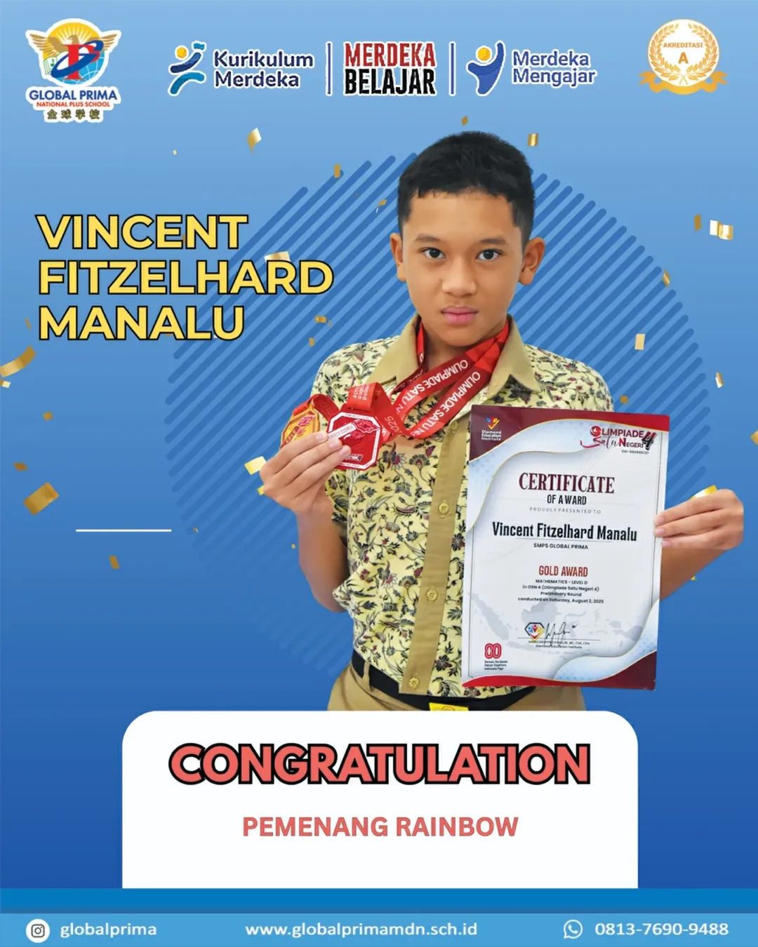02 Agustus Selamat kepada Vincent Fitzelhard Manalu (Kelas 8C) Atas prestasinya pada Olimpiade Satu Negeri Sesion 4 yang diselenggarakan oleh Diamond Education Institute atas Medali Emas dan Perfect Score dalam Bidang Matematika SMP Read More